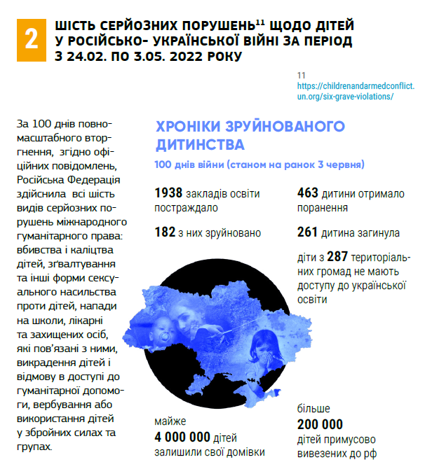 Росія не припиняє нехтувати міжнародними актами, стандартами та принципами, що стосуються захисту дітей у збройних конфліктах, завдаючи каліцтв та вбиваючи щодня українців, в т.ч. й маленьких громадян та громадянок України, скоюючи наступні порушення по відношенню до дітей: