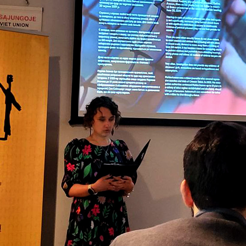 «У 2018 році білоруські та українські правозахисники влаштували моніторингову місію до Криму (зокрема, там були присутні правозахисники та представники Білоруського дому прав людини). І був випущений звіт з такою промовистою назвою «Крим. Розбиваючи стіну мовчання». Тому що вже тоді історії з півострова почали бути трохи затінені. І я хотіла б процитувати, що сказав один із представників білоруських правозахисників, який був частиною цієї місії: для нього була важлива участь у місії не лише як правозахисника, а й як білоруса, «бо Крим — це приклад того, на що може перетворитися Білорусь у подібних ситуаціях: на місце дислокації військових баз, на зону, де люди позбавлені можливості захищати свої права, на зону, де людям фактично заборонено ідентифікувати себе українцями». На жаль, ці слова стали пророцтвом, бо після 2020 року білорусів, котрі виступили за вільні вибори, за свободу слова, за незалежність — катують, піддають тортурам. Вони забрали свободу слова. У тому числі, вони не можуть висловлювати підриму Україні».