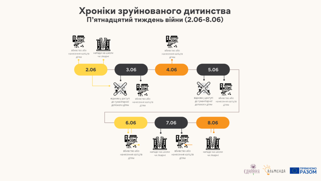 Закінчився п’ятнадцятий тиждень війни (02.06-08.06) і експерти ЦГП “Альменда” , однієї з організацій-засновниць ДПЛ “Крим”, підготували новий дайджест “Хронік зруйнованого дитинства”, до якого увійшли повідомлення про своєні воєнні злочини по відношенню до українських дітей за цей період.