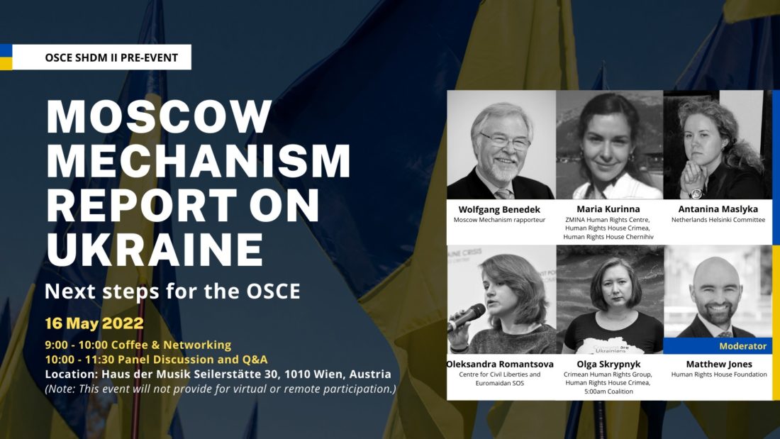 On 16 May 2022, Human Rights House Foundation and several Ukrainian and international partners will host “Moscow Mechanism report on Ukraine: Next steps for the OSCE,” a pre-event for OSCE delegations and stakeholders ahead of the Supplementary Human Dimension Meeting.