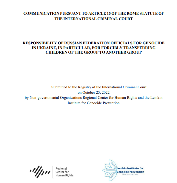 Одна з організацій-засновниць ДПЛ “Крим” Регіональний центр прав людини та американський Lemkin Institute for Genocide Prevention подали спільне повідомлення Міжнародного кримінального суду з проханням розслідувати вчинення Російською Федерацію злочину геноциду.