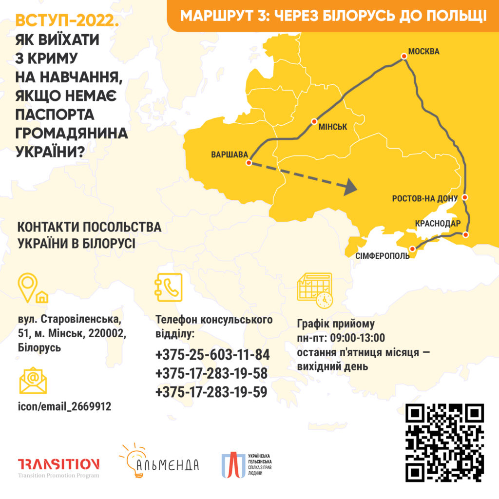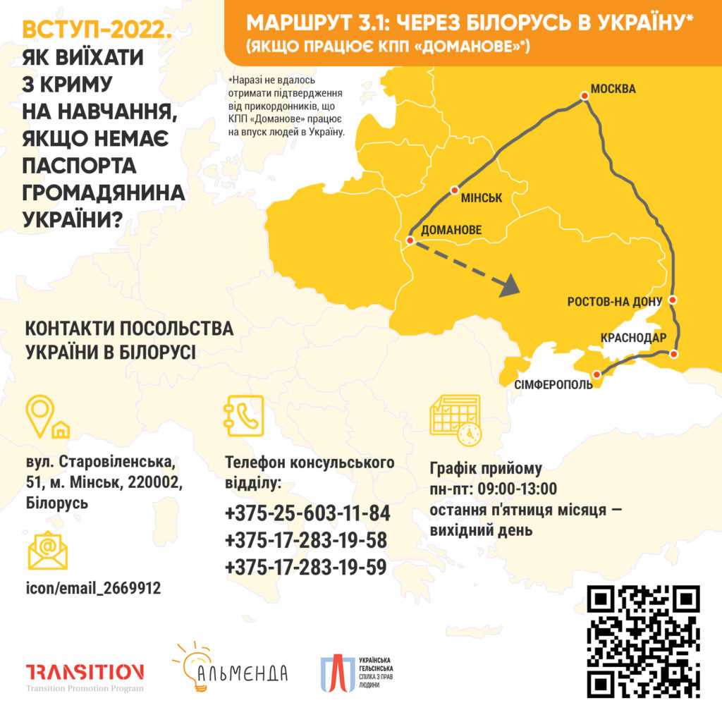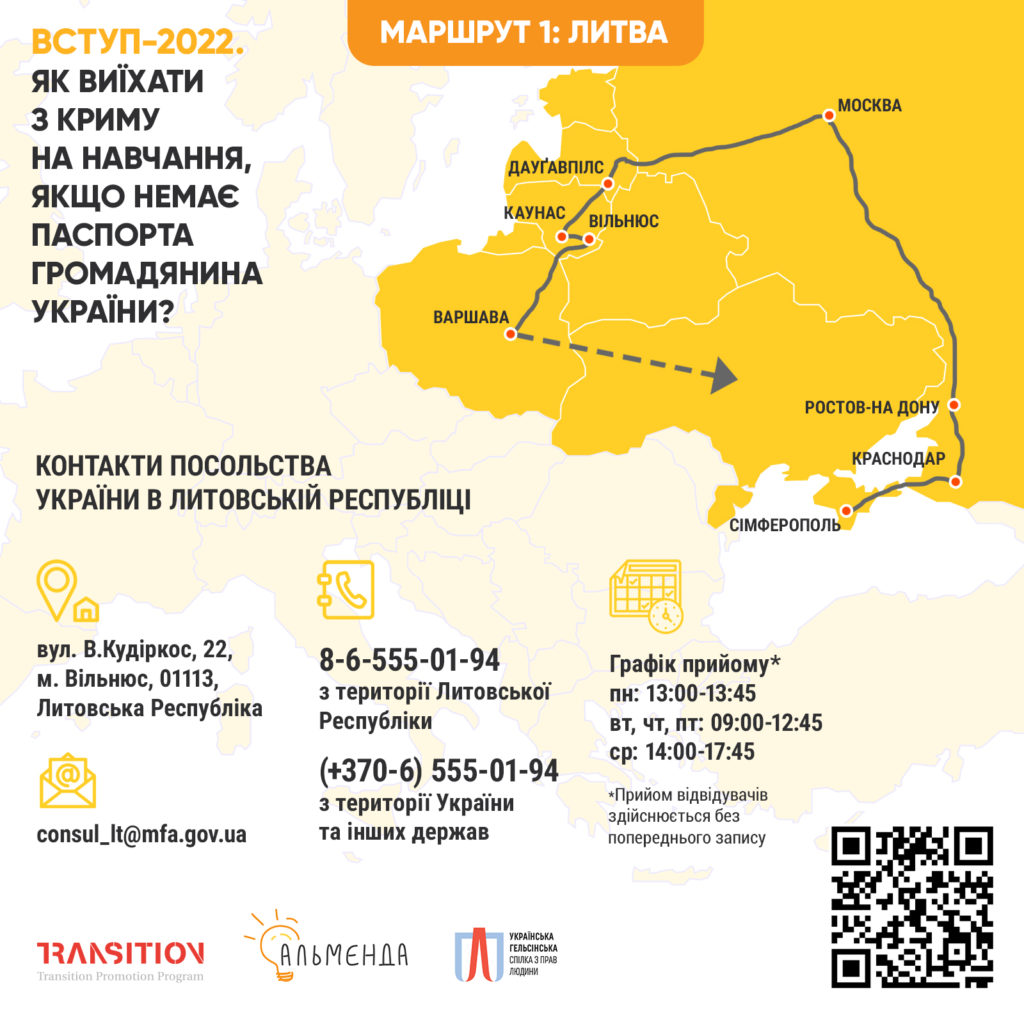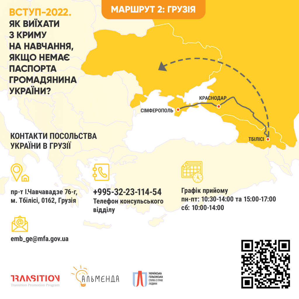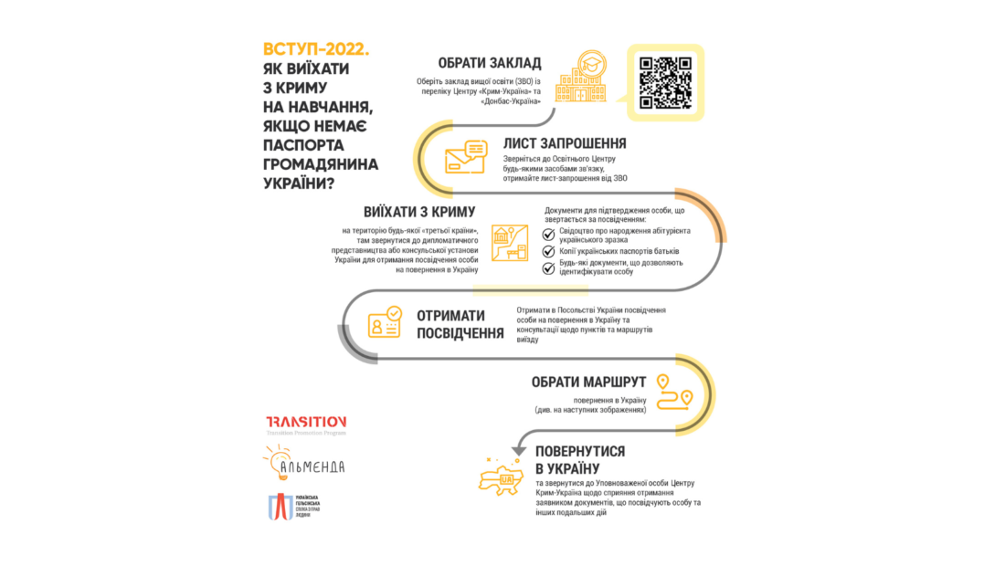 Діти та молодь з території тимчасово окупованого Криму може реалізувати своє право на освіту в закладах освіти на підкотрольній території України керуючись наступними маршрутами, які описані в інфографіці, підготовленою ЦГП “Альменда”, однією з організацій-засновниць ДПЛ “Крим” та Українська Гельсінська спілка з прав людини – УГСПЛ.